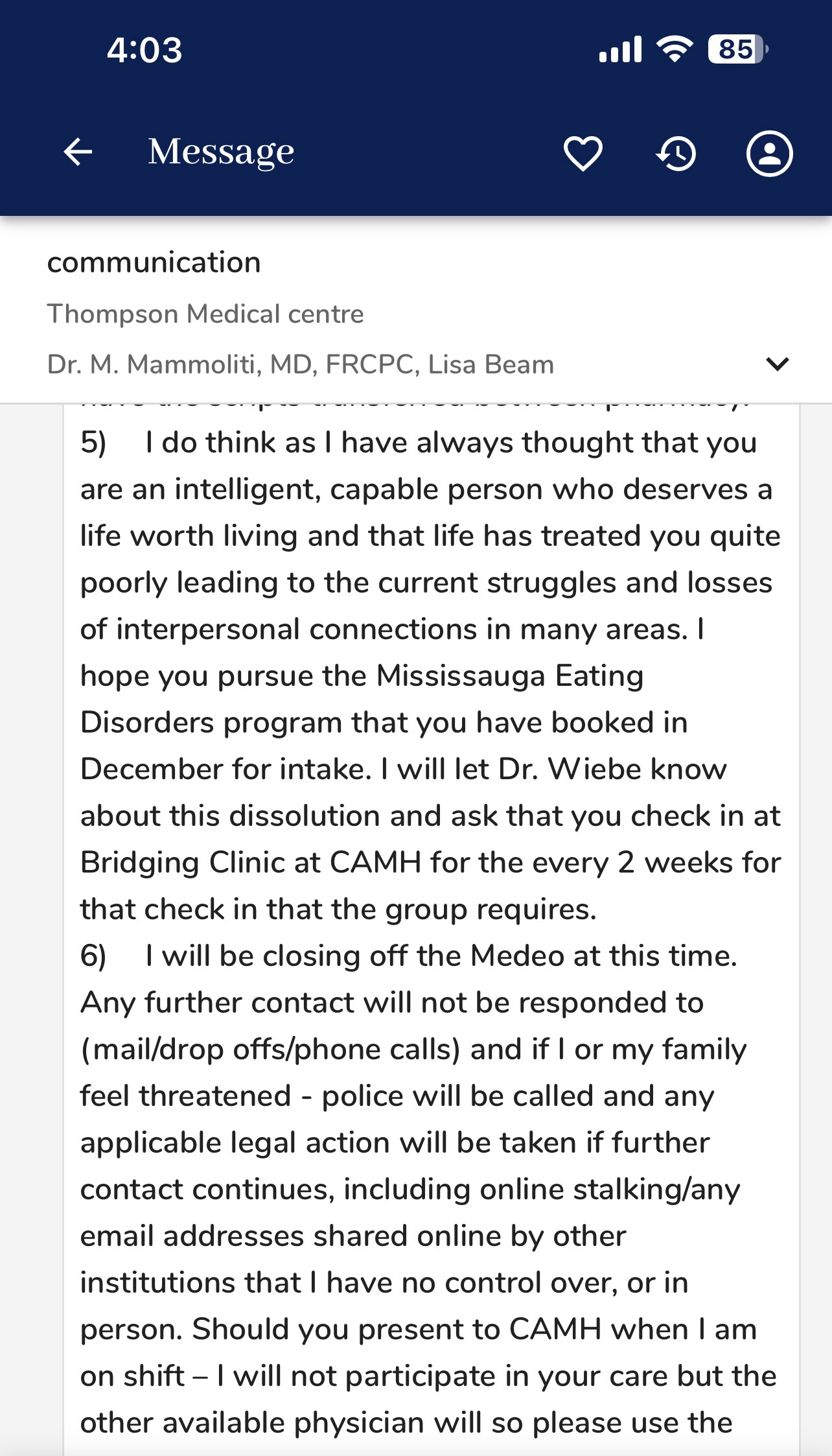 And WTF? Why was she bringing her family into this? There is nothing recorded in my/her medical records to suggest any concerns regarding this - until after she discharged me. Why was she talking about being threatened? Why was she creating a false narrative? She had a zero-tolerance policy for threatening behaviour: