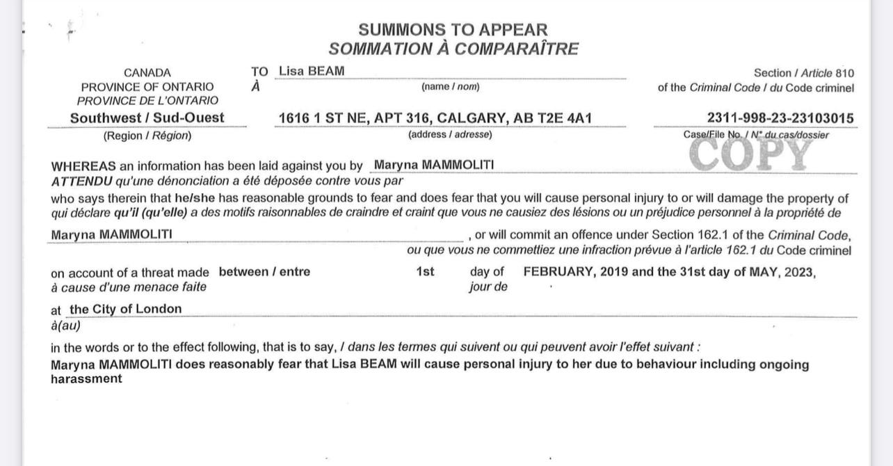 Further, she submitted this application on May 11, 2023, and May 12- 31, 2023, had not even occurred yet, when the application for a hearing was approved on May 31, 2023. The summons seems perjured. If it were true, then that would mean that I threatened her even before I met her. More about this peace bond application to come.