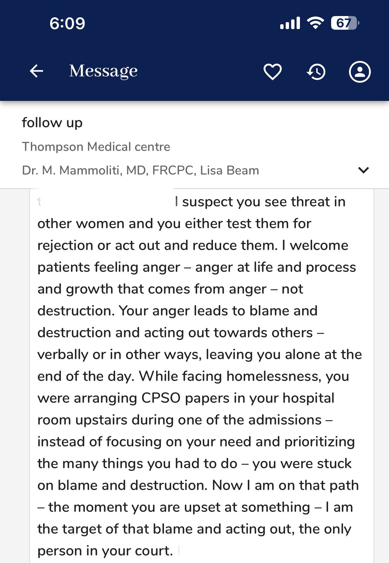 May 11, 2023, was three days after my dad passed away. I don’t know if she knew, or if I had even told her lawyers yet (I checked, yes, I told them he had a fall just after Easter). I was in the midst of trying to correct my medical records. They were littered with spelling and grammatical errors, and contained at least eight lies/falsities that I could prove otherwise, or at the very least, cast reasonable doubt upon. UPDATE: At this time, Mammoliti still refuses to correct these entries, even though she made them after she discharged me. Not sure what she’s trying to protect.